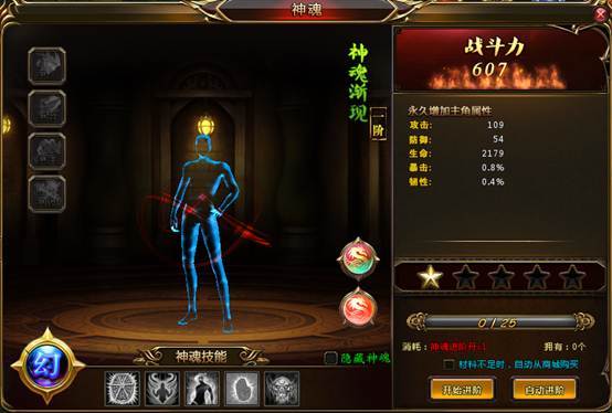 (2)神魂进阶需要消耗:“神魂进阶丹”。该道具可通过声望商店兑换,神魂进阶副本等方式获得。每颗神魂进阶丹可提升神魂进阶祝福值,当神魂进阶祝福值达到满值时,神魂将进阶到下一阶。